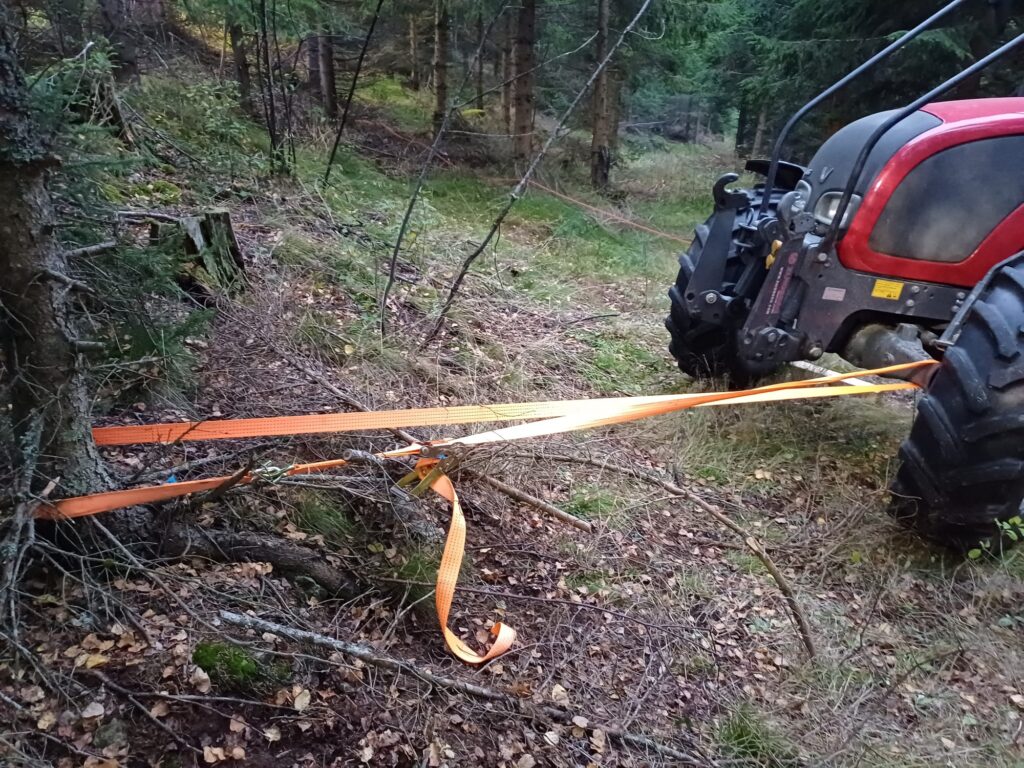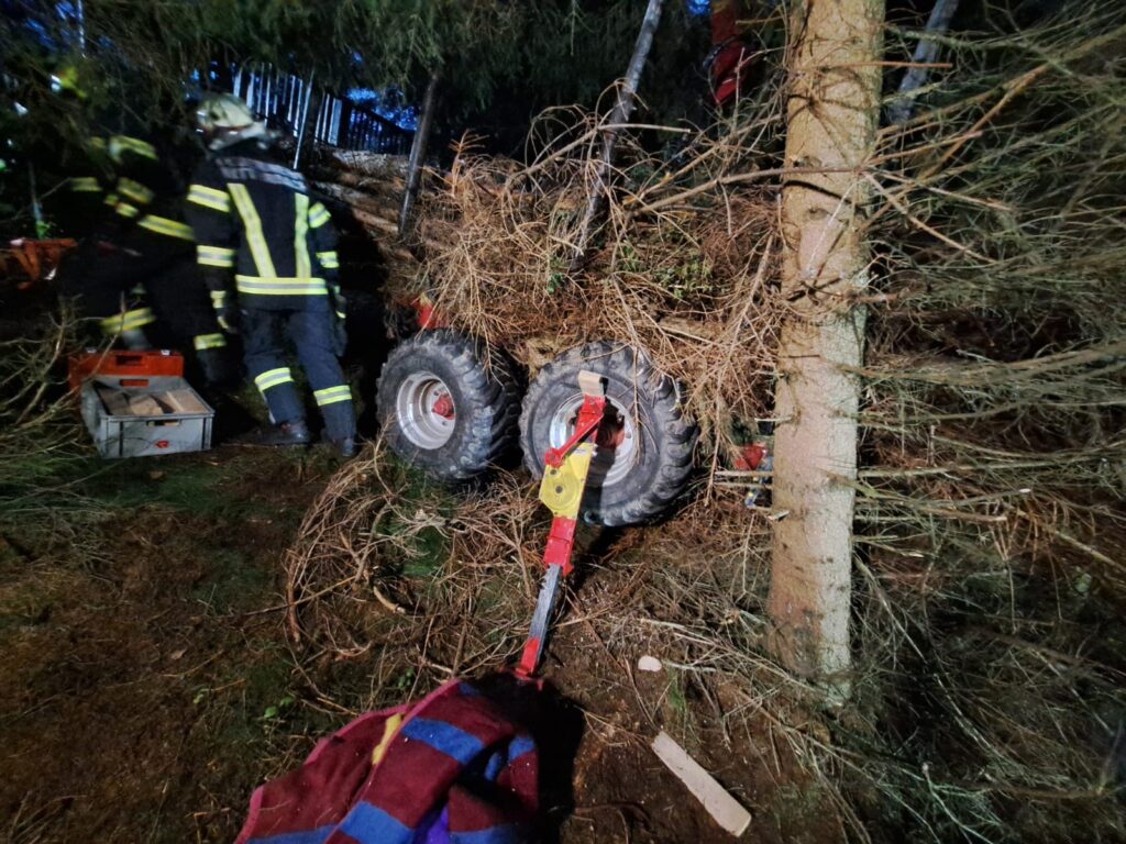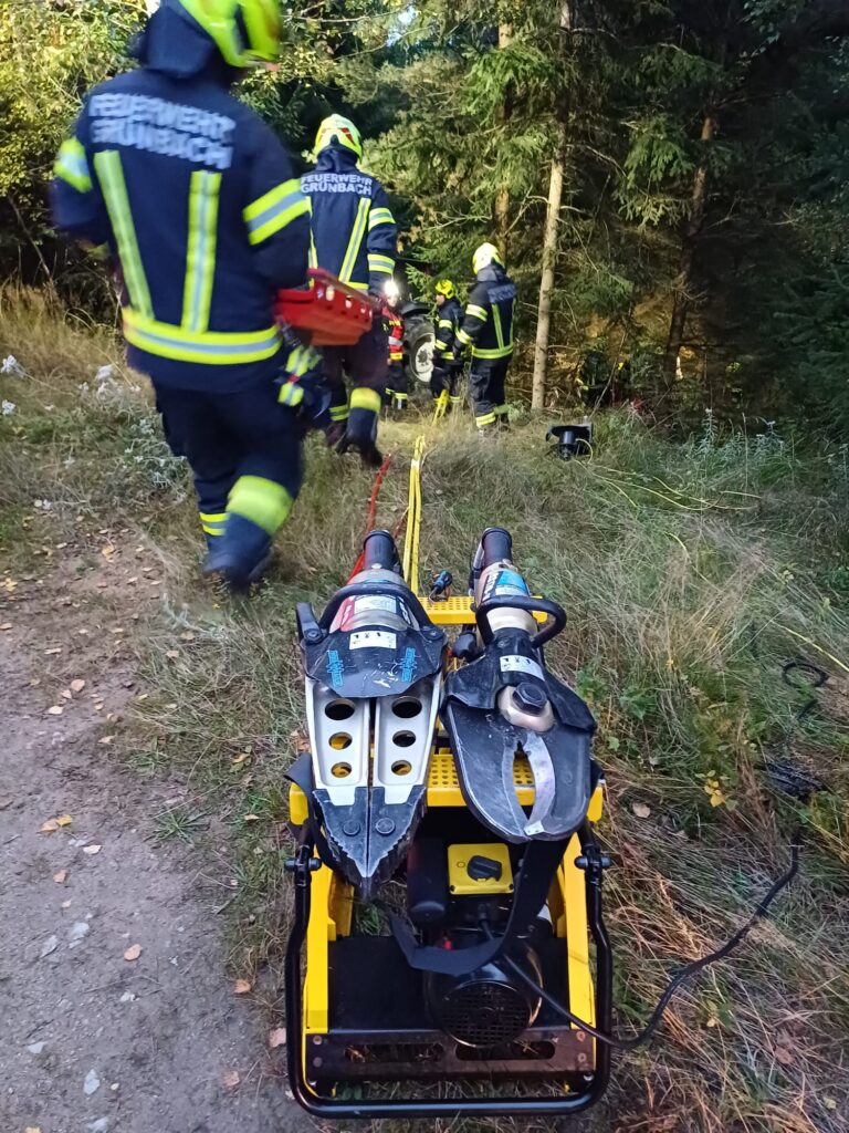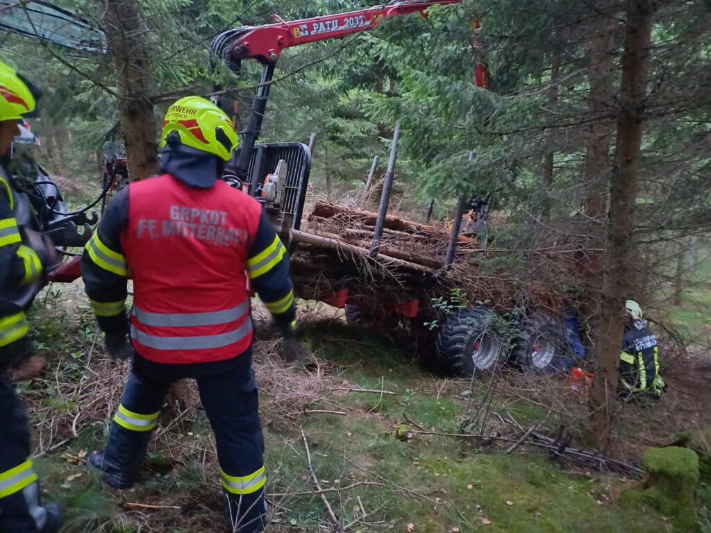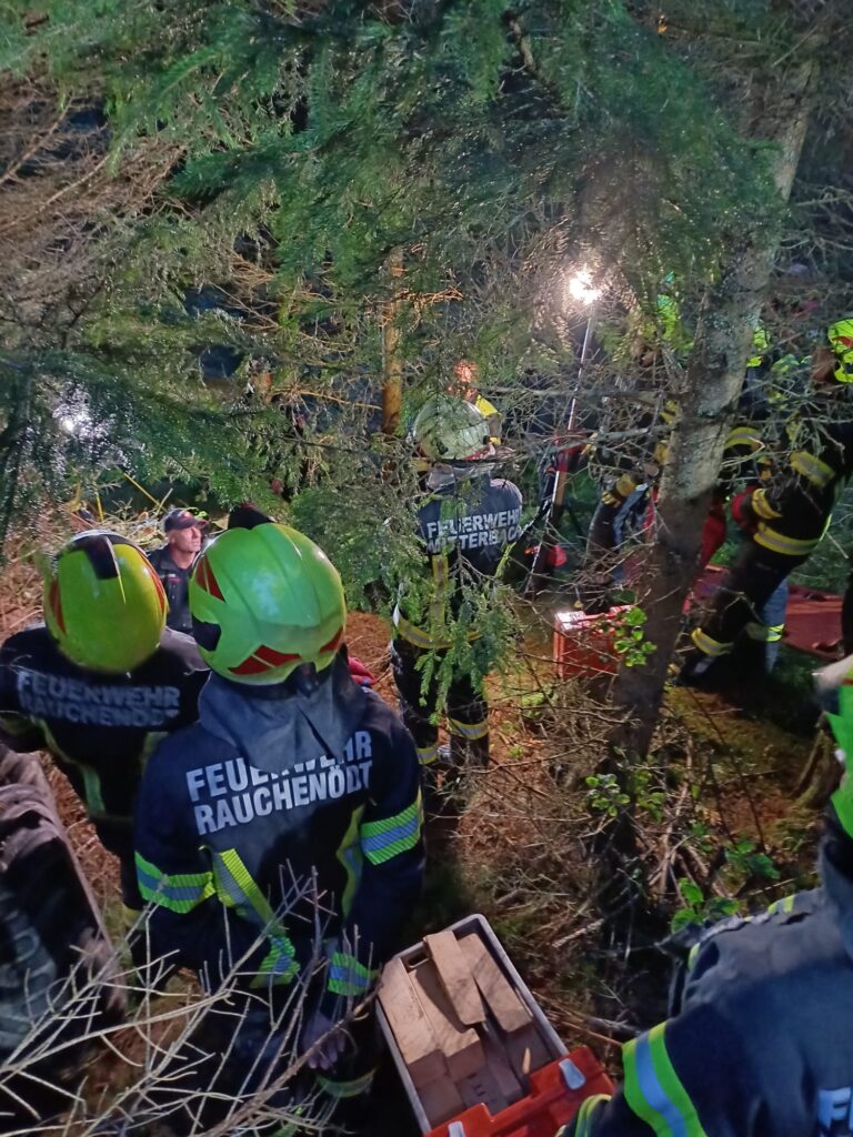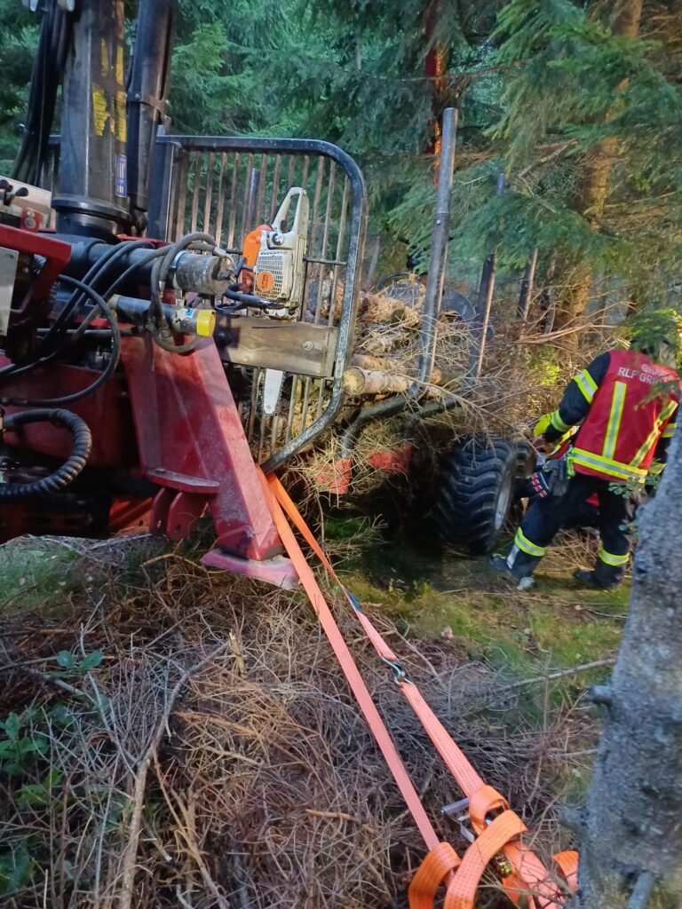 Übungsannahme war ein Forstunfall mit einem Traktor samt Rückewagen mit eingeklemmter Person. Die eingeklemmte Person musste aus schwer zugänglichem Gelände gerettet werden.