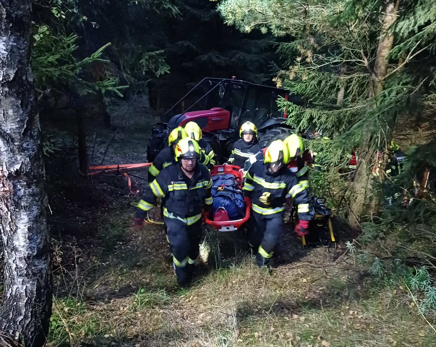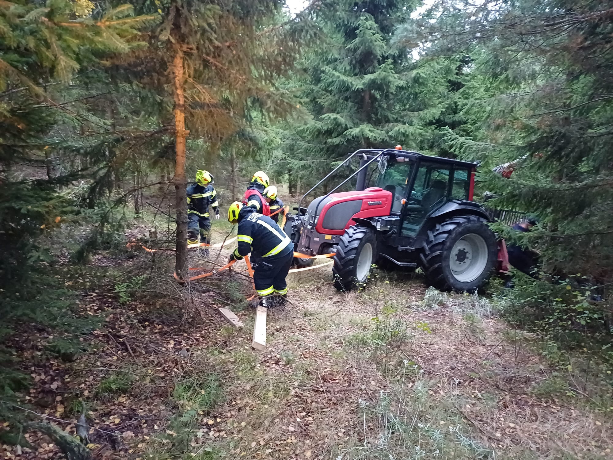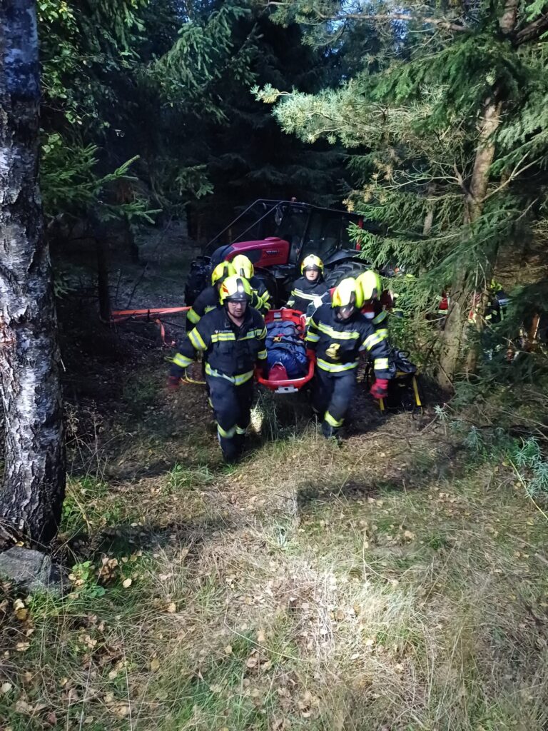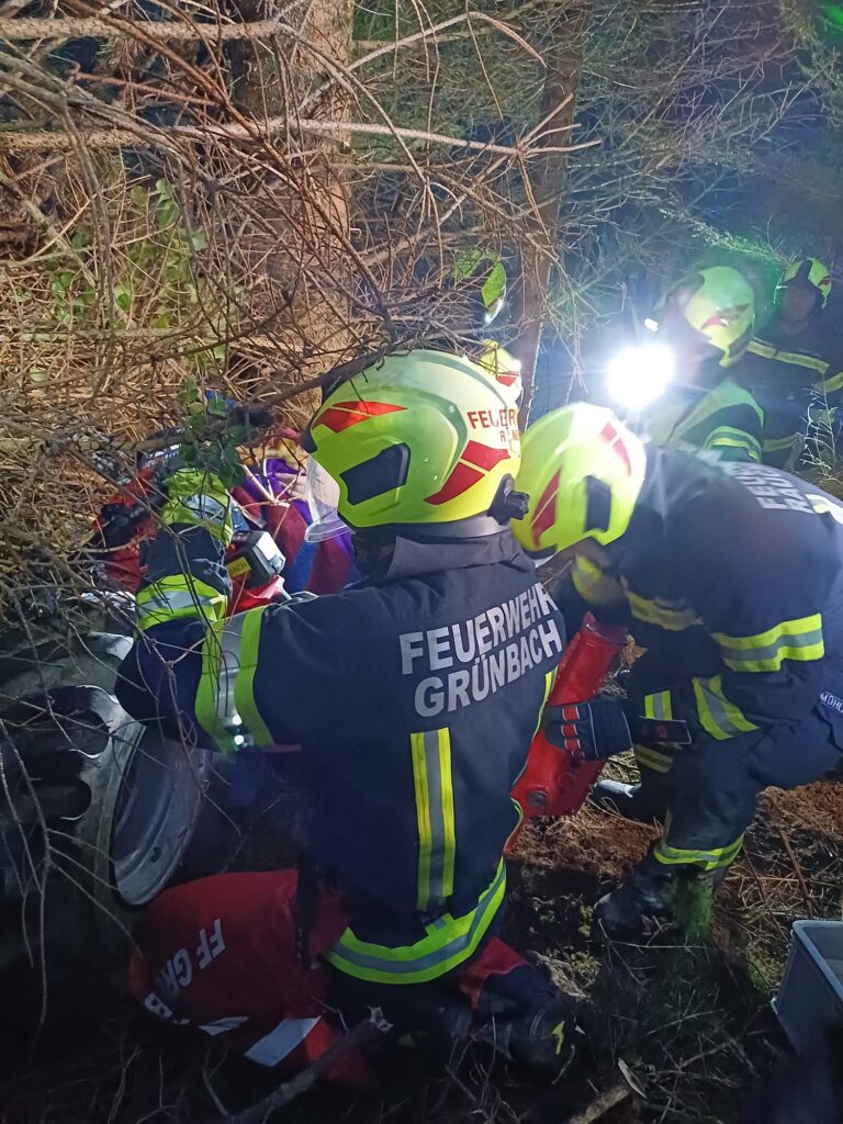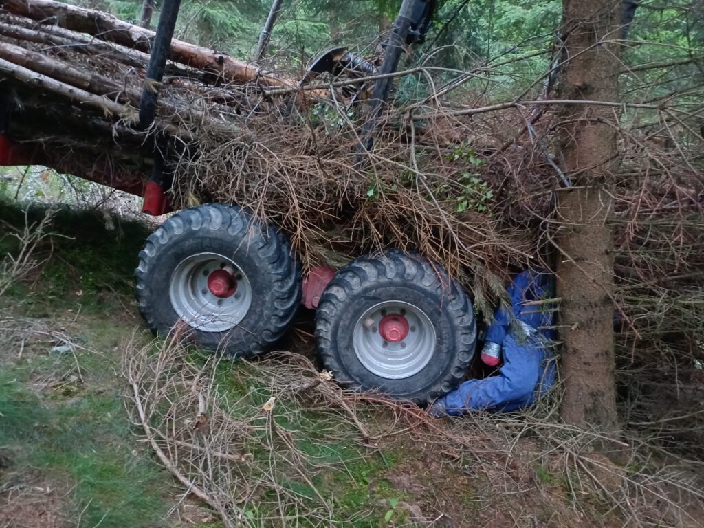 Übungsannahme war ein Forstunfall mit einem Traktor samt Rückewagen mit eingeklemmter Person. Die eingeklemmte Person musste aus schwer zugänglichem Gelände gerettet werden.